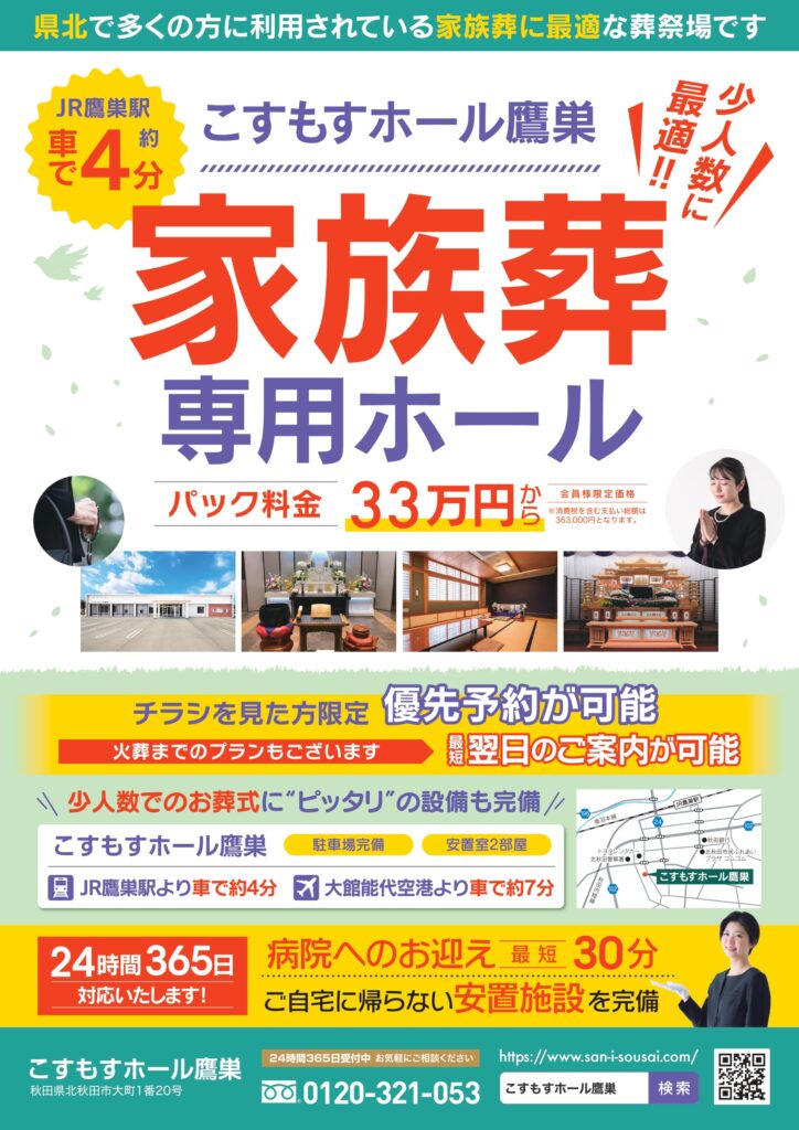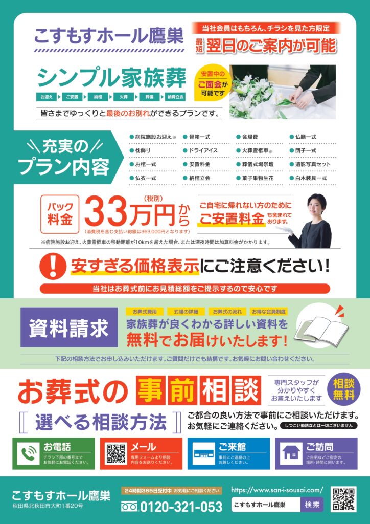 こすもすホール鷹巣では、24時間365日体制でご相談・お迎えに対応しております。
